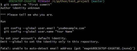 이런 메시지가 나오는 것은 Git에 commit을 하려면 작성자를 인식할 수 있어야 하는데 아직 사용자 정보를 등록하지 않았기 때문입니다(이전에 이미 사용자 등록을 아셨다면 바로 진행하시면 됩니다).