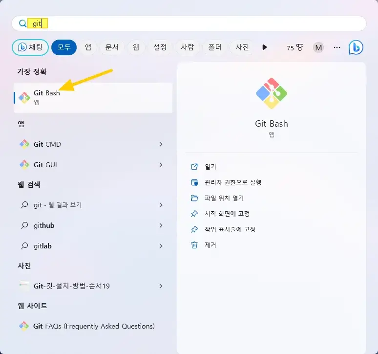 윈도우 스타트 메뉴에서 Git Bash를 검색해서 실행합니다(Git Bash는 위에서 소개한 링크에서 처럼 깃을 설치하는 과정을 거치면 나옵니다).