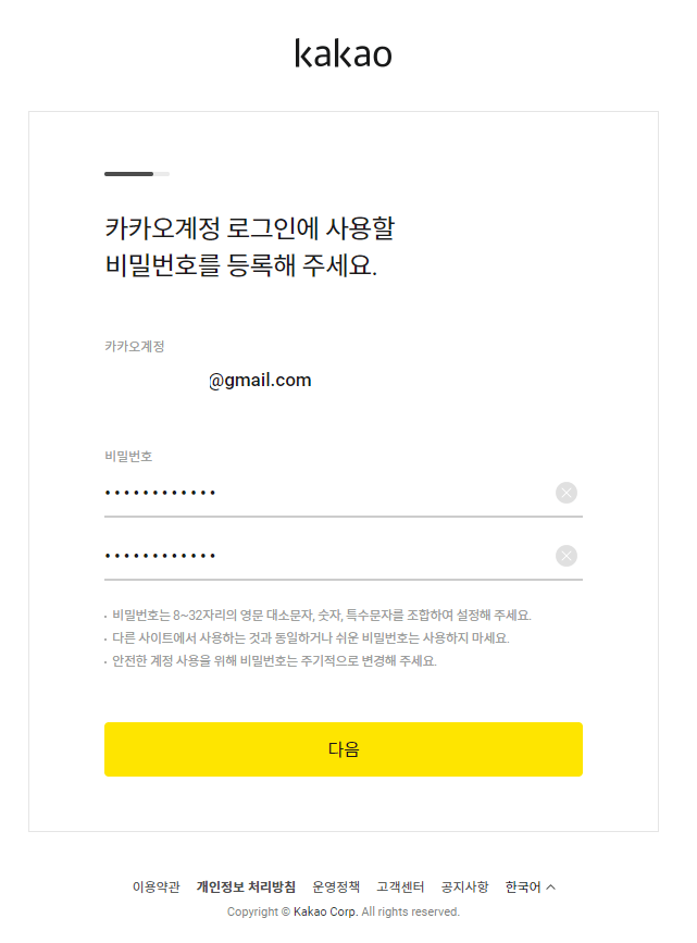 카카오 계정에서 사용할 비밀번호를 2번 입력합니다.
